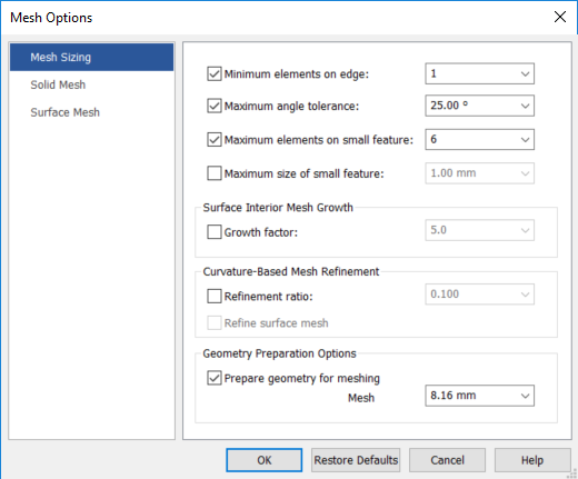 The Mesh Options dialog box contains options for improving the mesh results using the Mesh command or the mesh sizing commands. Selected options are applied and saved with the study when you select the Mesh button or the Mesh & Solve button in the Mesh dialog box.