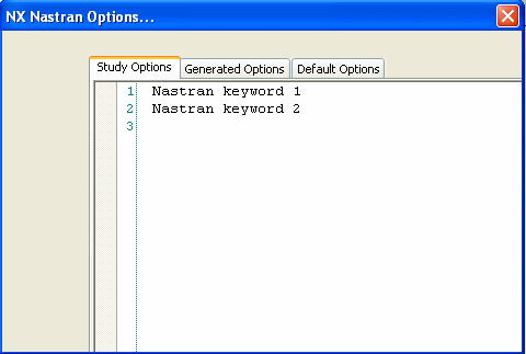 The NX Nastran Keyword Editor is a multi-tabbed text edit window for advanced users to review default processing options and to add and edit user-defined keywords and values to the Study Name.rcx file. This editor displays three tabs: