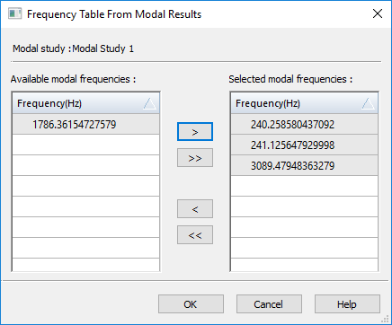 Note that when you run a Normal Modes study, unless you change the Number of modes setting in the Create Study dialog box, by default the study solves for four frequency modes in the study geometry. When you open the Frequency Table from Modal Results, all four modes are listed and selected. If you choose three of the modes from the table as the basis for the harmonic response study, then three normal modes will be created within the harmonic frequency response analysis results set.