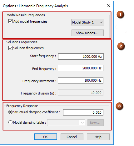 If the frequency results from a prior Normal Modes study are available in the study document, then you can select the frequencies automatically when you define the study options in the dialog box Options: Harmonic Frequency Analysis. Using the known results of the Normal Modes study creates a more accurate frequency table for the Harmonic Response study. To access these results, use the options in the Modal Result Frequencies section (1) of the dialog box. You can choose a subset of the normal modes using the Show Modes button to open the Frequency Table from Modal Results dialog box.