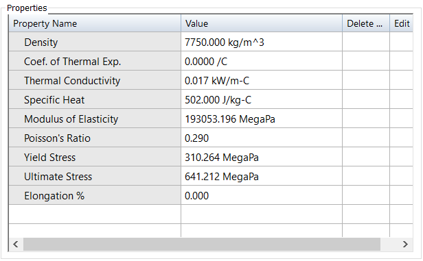 These are the material properties defined for Stainless Steel in the Material Table.