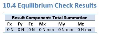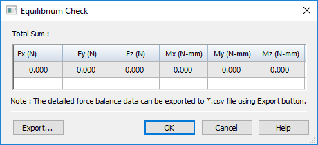 . The equilibrium check calculates the total summation of forces (Fx, Fy, Fz) and moments (Mx, My, Mz) for the simulation study geometry.