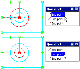 When modifying a profile or sketch, it can be useful to determine the parent elements for a relationship. When you select a geometric relationship, the parents highlight. For example, when you select the horizontal relationship shown in the first illustration, the left vertical line and the circle are highlighted as the parent elements.