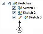Whether you lock the sketch plane automatically or manually, a locked plane indicator (A) appears in PathFinder adjacent to the sketch which is locked.