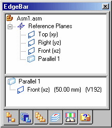 Later, when you return to the assembly, you can edit the offset value of the assembly reference plane to change the feature extent. To edit the offset value of an assembly reference plane, select the reference plane in the top pane of PathFinder, then select the offset value in the bottom pane. You can then type a new value in the command bar. You can also use the variable table to edit the offset value of the assembly reference plane.