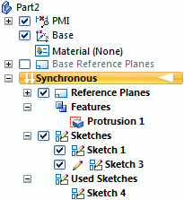 The sketches you draw are listed in PathFinder. PathFinder also lists the base coordinate system, PMI dimensions, the base reference planes, features you construct, and used sketches.