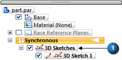 In the synchronous environment, you start 3D sketching by choosing a 3D sketching command from the 3D Sketching tab→3D Draw group. Once you choose a command, a 3D Sketches collector (1) is added to PathFinder.