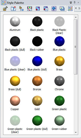 When working with assemblies, you can use the Style Palette pane to change the colors of faces on parts and components. The Style Palette displays the material color swatches that represent the materials available in the Material Table dialog box.