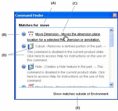When the Show matches outside environment link is displayed, you can click it to see commands found in other environments.