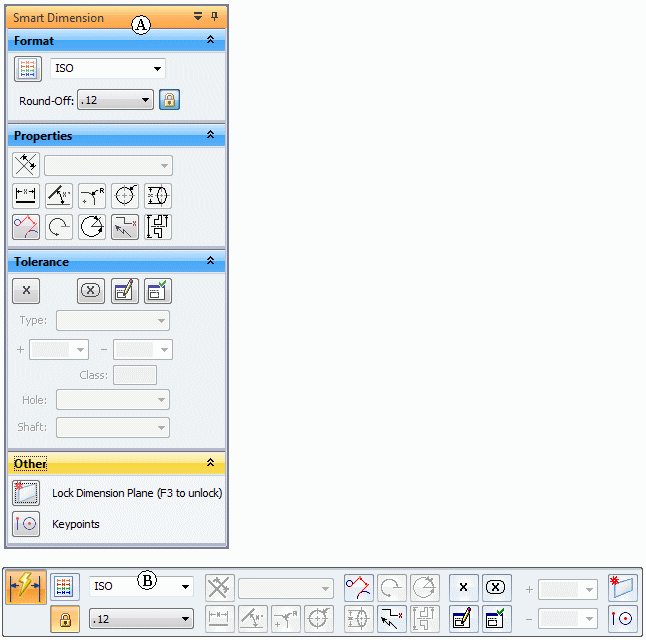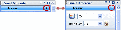 In the vertical command bar form (A), to hide or show the options available for a group, such as the Format group or the Properties group, click this icon