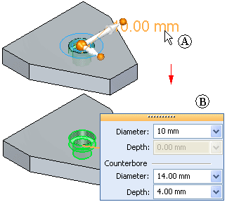 When you select a manufactured feature, such as a counterbore hole, two handles are displayed: the 2D steering wheel (A) and the edit definition handle (B).