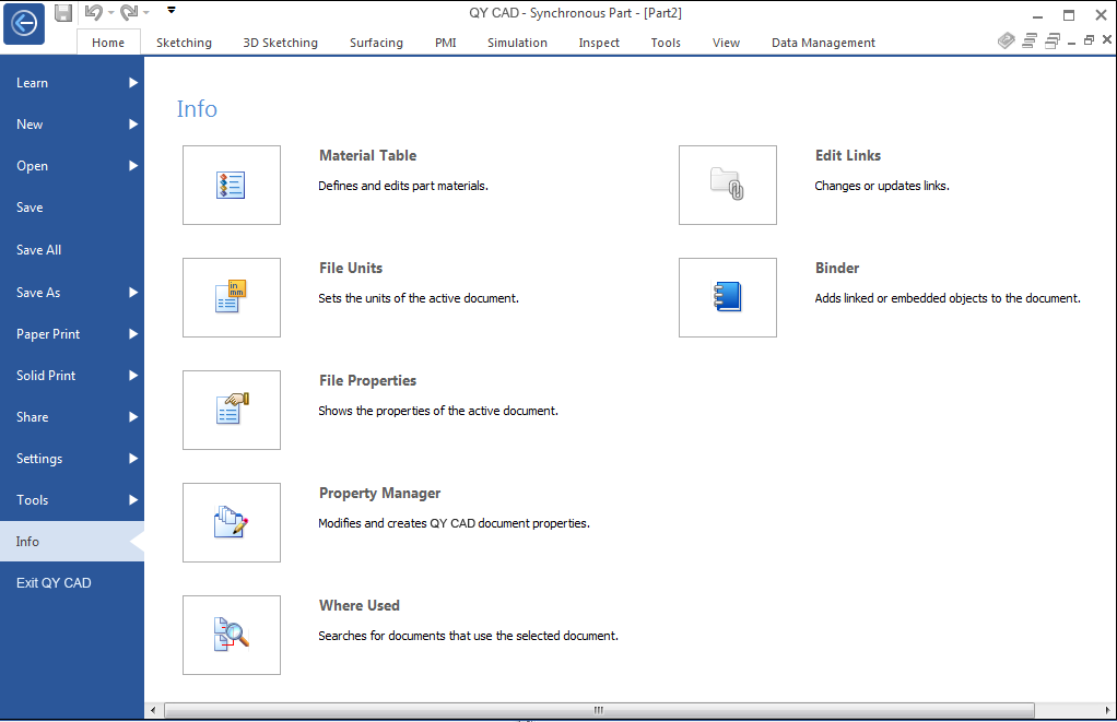 The Application menu employs the same touch-friendly backstage interface that Microsoft uses in its Office products, such as PowerPoint, Excel, and Word. The backstage is where you manage your files and the data about them—creating, saving, adding custom file properties and materials, and setting options.