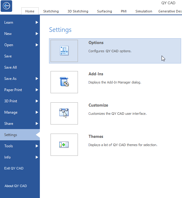 | Open the QY CAD Options dialog box to specify the type of tooltip you want to see. Open the Customize dialog box to customize the default arrangement of tools, commands, and keyboard functions. Change the QY CAD Theme. | Click the Settings tab.
