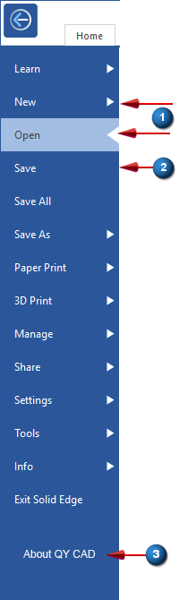 | (1) Display a page of related functions in the backstage area. (2) Perform the indicated action: Save, Save All, and Exit QY CAD. (3) Open the About QY CAD dialog box to see your installed products, license, and version. |