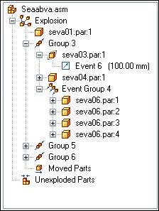 The way the parts and subassemblies are arranged in the Explode PathFinder tab is based on the operations you performed to create the exploded view. These operations, or events, are collected into one or more explode operation collections in Explode PathFinder.