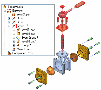 Similar to the PathFinder tab in an assembly, when you select an entry in Explode PathFinder, the associated parts highlight in the graphics window. For example, if you select a Group entry in Explode PathFinder, the parts associated with that entry highlight in the graphic window.