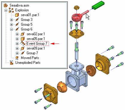 An Event Group collects all the components that will move simultaneously in an animation. For example, a pattern of fasteners would typically be in an Event Group. You can add parts to and remove parts from an event group.