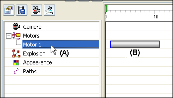 When you add events to an animation, an event entry (A) is added to the event category in the left pane, and one or more event duration bars (B) are added to the right pane. For example, when you add a motor event to an assembly animation, a motor event entry (A) is added to the Motors category in the left pane, and an event duration bar (B) for the motor event is added to the right pane.