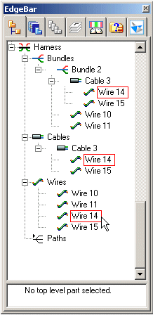 If you position the cursor over a bundle in PathFinder, all occurrences of the bundle are outlined and the bundle highlights in a solid color. Notice that the wires and cables included in the bundle do not highlight.