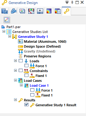In the Generative Design pane, the active study is shown in blue text. You may want to assign each study a custom name using the Rename command on its shortcut menu. The same name is assigned to the generative study result.