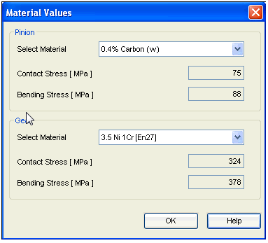 Simply select the material from respective material selection control. The values for Contact Stress and Bending Stress will be automatically displayed as per the material, which are stored in database. Remember when you are using SEER Standard material you cannot change these values.