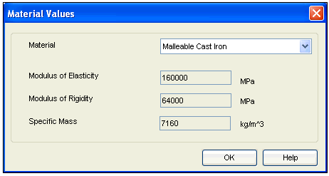 Simply select the material from respective material selection control. The values for Modulus of Elasticity, Modulus of Rigidity and Specific Mass will be automatically displayed as per the selected material, which are stored in database. Remember when you are using SEER Standard material, you cannot change these values.