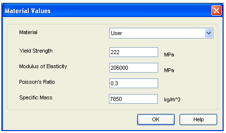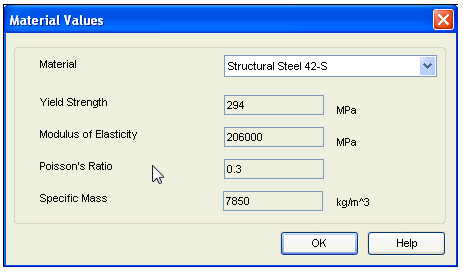 Simply select the material from material selection control. The values for Yield Strength, Modulus of Elasticity, Poisson’s Ratio and Specific Mass will be automatically displayed as per the material, which are stored in database. Remember when you are using SEER Standard material you cannot change these values.