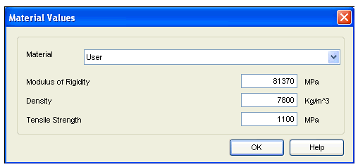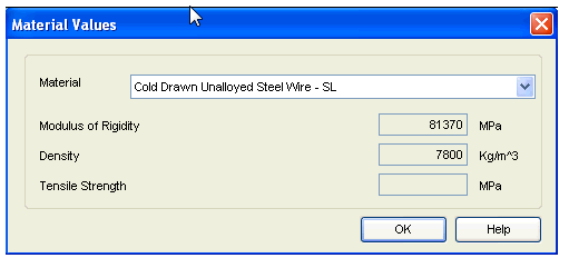 Simply select the material from material selection control. The values for Modulus of Rigidity and Density will be automatically displayed as per the material, which are stored in database. Remember when you are using SEER Standard material you cannot change these values. The value of Tensile strength varies as per material selected and Wire Diameter of the spring. Therefore it is not displayed but it is taken directly from the database. The value is shown on Calculated Results tab under strengths.