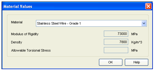 Simply select the material from material selection control. The values for Modulus of Rigidity and Density will be automatically displayed as per the material, which are stored in database. Remember when you are using SEER Standard material you cannot change these values. The value of Allowable Torsional Stress varies as per material selected and Wire Diameter of the spring. Therefore it is not displayed but it is taken directly from the database. The value is shown on Calculated Results tab under strengths.