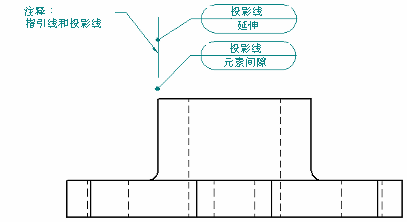 指定如何显示指引线和投影线。当注释移动超过其所附加的注释元素边缘时,将应用元素间隙和延伸量设置,如下图所示。