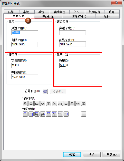 "THRU" 和"DEEP" 等词是纯文本。可以使用智能深度选项卡上的按钮代替符号,也可以通过在框内单击然后选择选择符号和值按钮