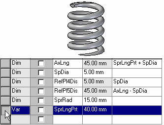 例如,要使弹簧的长度显示为可调,可通过选择变量表中的变量将控制弹簧长度的变量 SprLngPrt 添加到可调参数列表中。