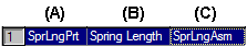 在装配环境中,“可调零件”对话框有三个列:零件变量 (A)、注释 (B) 和装配变量 (C)。在此列中,零件变量 SprLngPrt 是由装配中的测量变量 SprLngAsm 来控制的。