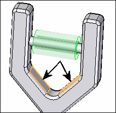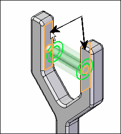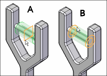 下图显示了在基于单个元素 (A) 构成关系时如何选择滚子上的中点(使用参考平面),或者在使用放置零件上的双元素 (B) 构成关系时如何标识滚子各端上的曲面元素。