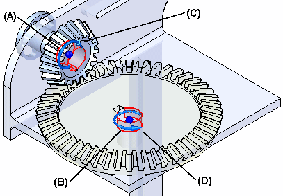 示例:该示例使用两个零件 (A) 和 (B) 上的圆柱面来定义关系。请注意指示移动方向 (C) 和 (D) 的符号。在此示例中,命令条上的比率/齿数选项设置为齿数,每个齿轮的齿数用于指定移动值。