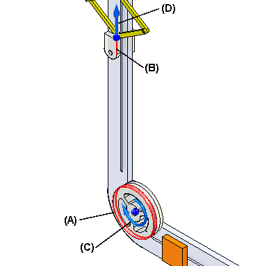 示例:该示例说明如何使用带轮 (A) 上的圆柱面和在插槽中滑动的零件 (B) 的直线边。请注意指示旋转 (C) 和线性 (D) 移动方向的符号。在此示例中,线性距离零件 (B) 将在零件 (A) 旋转一圈时移动。在此示例中,所指定的线性距离等于带轮上的圆柱面的周长。