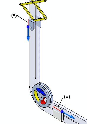 示例:该示例说明在插槽中滑动的零件 (A) 上的线性边和零件 (B) 上的线性边。此示例指定了零件 (A) 和 (B) 移动的线性距离。线性-线性选项还可以用于指定两个水力或风力传动装置之间的移动。如果传动装置具有不同的内径,可使用命令条上的值框来定义适当的比率。