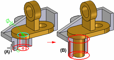特征的延伸量与您选择的零件的关键点相关联。如果其他零件已被修改 (B),以至于关键点位置发生了变化,那么链接特征的延伸量也会得到更新。