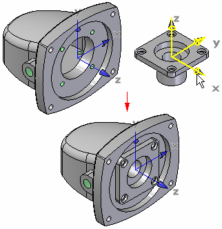 下图演示了已放置零件的 x、y 和 z 轴是如何与装配中已有零件的坐标相对齐的。通过应用三个平面对齐关系来让零件与各零件的三个坐标系平面相对齐。