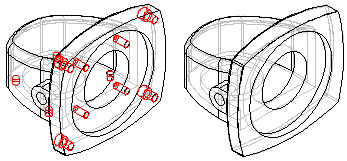 也可以通过添加拉伸和旋转拉伸以及拉伸和旋转除料来简化零件。“简化模型”环境中包含构造特征命令,因为有时通过添加一个新特征比删除很多特征更容易简化零件。例如,可以构造一个妨碍多个特征的拉伸,然后以一个操作删除许多曲面。