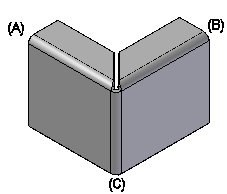 在封闭三折弯角时,使用两个外部折弯 (A) 和 (B) 作为输入。折弯必须具有相同的折弯角度和折弯半径,折弯角度必须小于等于 90 度。它们的中心线必须在 3D 空间相交,而且必须通过一个公共连接折弯 (C) 相连接。
