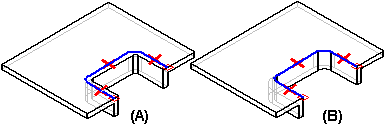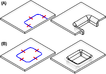 可以使用开放轮廓 (A) 或封闭轮廓 (B) 来构造冲压除料。