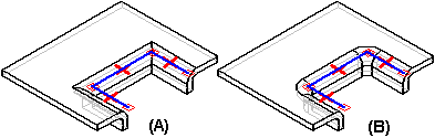 当拉拔无弧冲压除料的轮廓时,也可以使用“冲压除料选项”对话框中的“自动倒圆轮廓角”选项来指定角为斜接型 (A) 还是倒圆型 (B)。