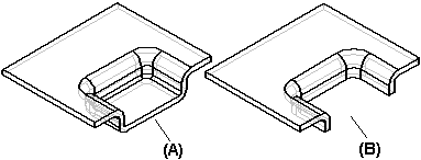 构造凹坑与构造冲压除料很相似。这两种特征之间的主要差别是:凹坑具有 "bottom"(底)(A),冲压除料 (B) 则没有。