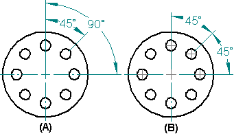 放置用来测量元素或关键点的夹角的尺寸。当您选择元素或关键点时,尺寸被放在四个象限的其中之一中。当您移动光标时,尺寸会以动态方式转至另一个象限。可在层叠尺寸 (A) 或成链尺寸 (B) 组中放置角度尺寸。