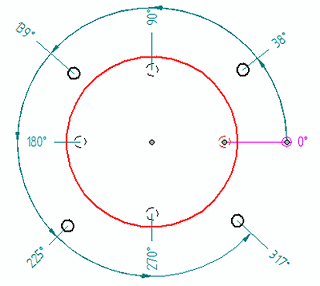 角坐标尺寸命令 用于放置测量中心点、轴和测量点之间角度的尺寸。所计算的值是轴与由测量点到中心点的直线间的夹角。组中所有的尺寸都使用相同的中心点和轴。