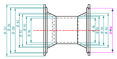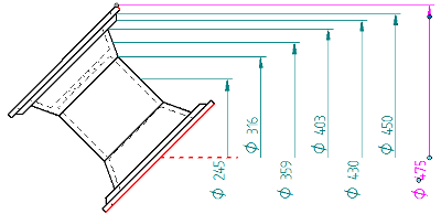 定义中心轴之后,在您通过单击来放置第一个尺寸之前,您可以更改对称直径尺寸层叠的默认方向,为此请按住 Alt 键并移动光标来定位尺寸。如果您释放 Alt 键,该尺寸会恢复为先前方位。