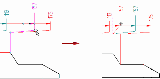 示例:当您开始拖动左图所示折线处的编辑手柄时,可以对齐右图所示的虚线以拉直投影线。