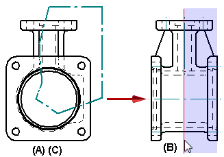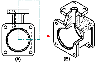 也可以指定要局部剖的图纸视图不同于绘制轮廓所在的图纸视图。例如,您可在主视图上绘制轮廓 (A),然后指定轴测图被局部剖 (B)。局部剖垂直于源视图的面。