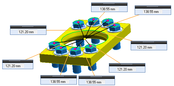 3D 测量命令可用来测量许多参数,例如距离、角度、体积和面积,并提供使用这些值定义变量(如需要)的选项。将对多个结果(例如端到端线或多个面的表面积)的单个值进行求和并显示总值。